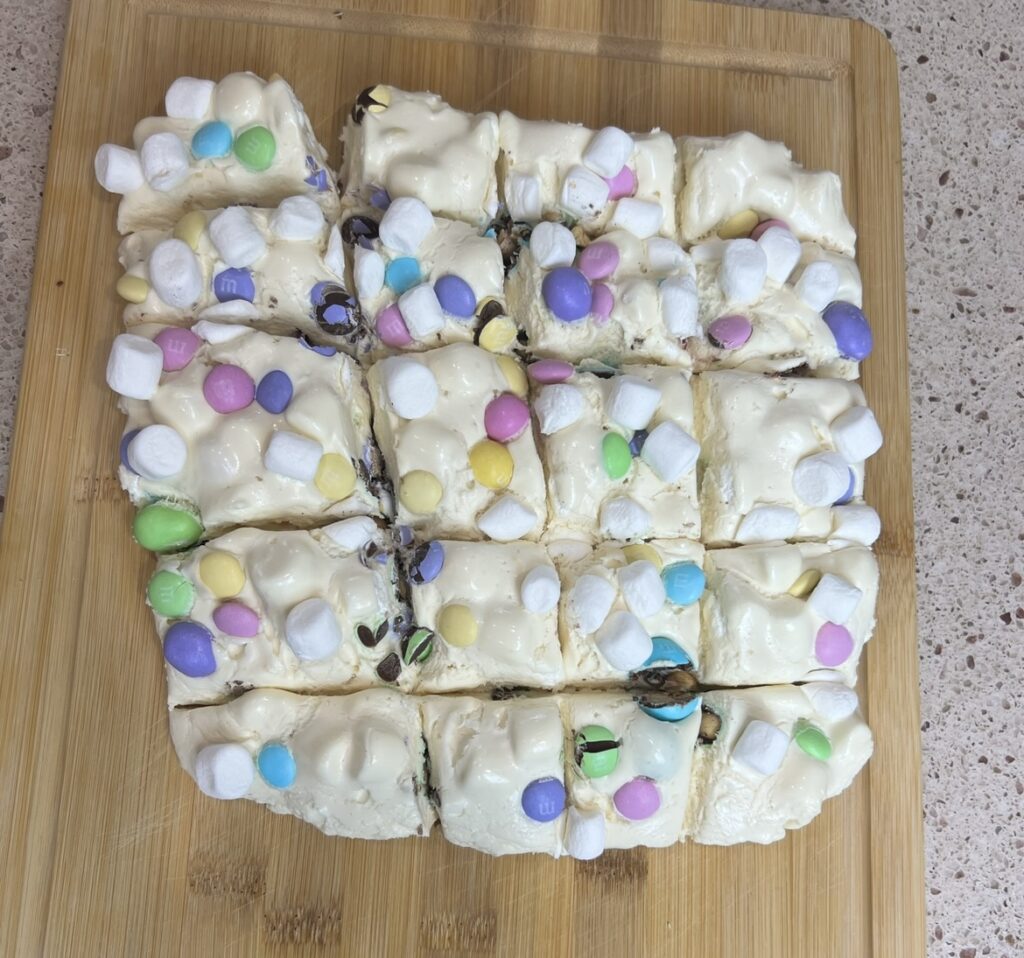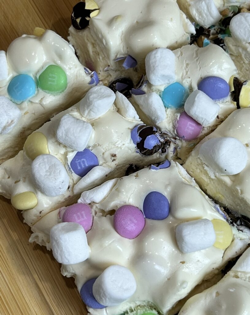 - Top with the remaining marshmallows and candies. Let set completely before cutting into squares.