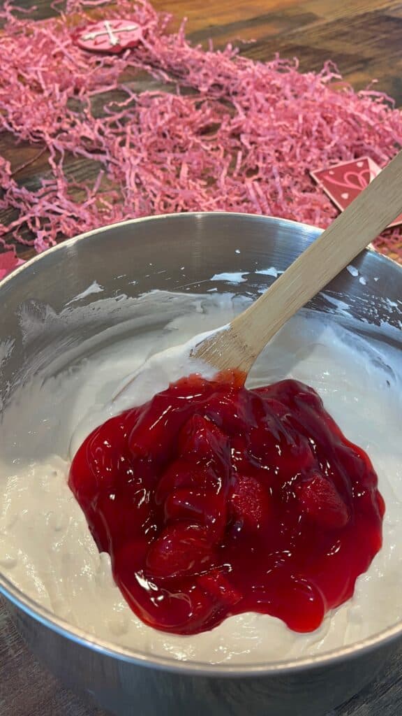 - Add the sweetened condensed milk and strawberry purée and mix until creamy and fluffy.