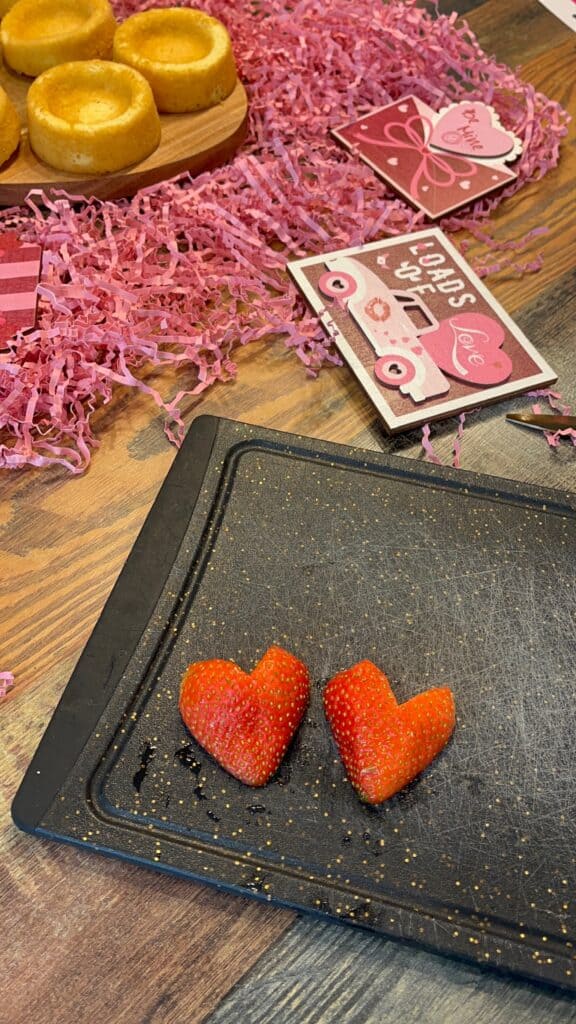 - Cut a small triangle out of the top center of each strawberry to create a heart shape.