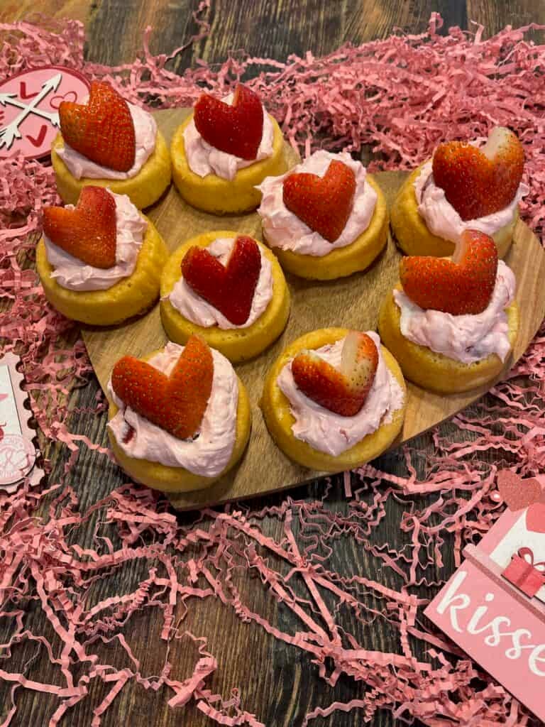 They’re soft, creamy, fruity, and just the right amount of sweet. Made with mini angel food cakes, a fluffy strawberry cream filling, and adorable heart-shaped strawberries on top, these little desserts feel special without being heavy. And best of all? They’re incredibly easy to make — no baking required.