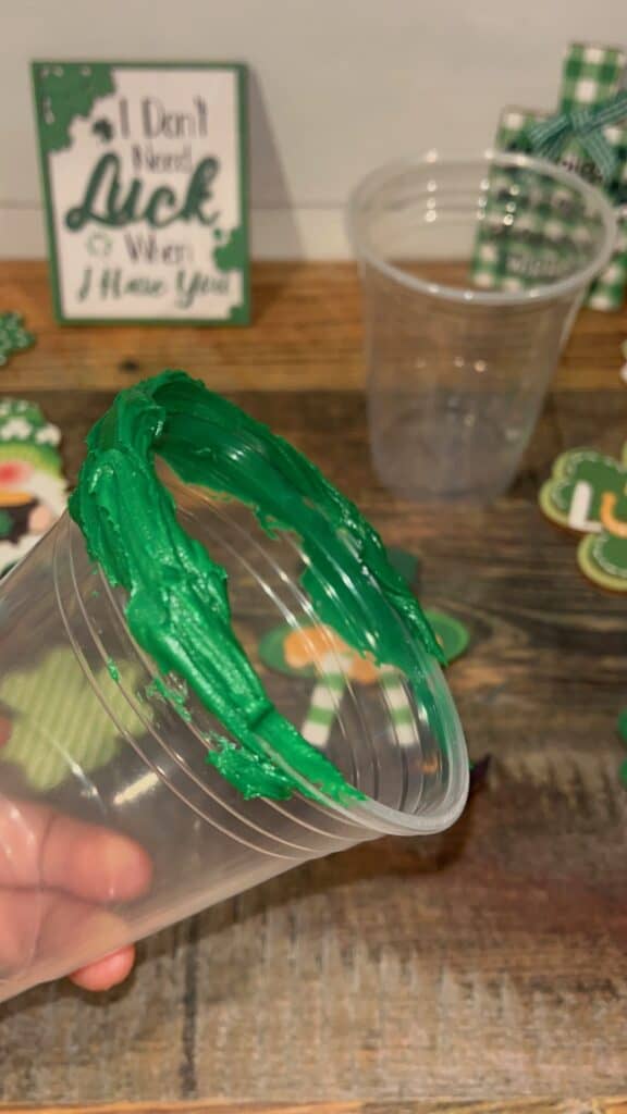 Take a 16-ounce plastic cup and line the rim with green icing.