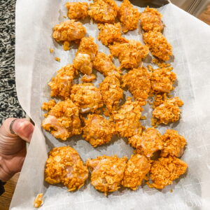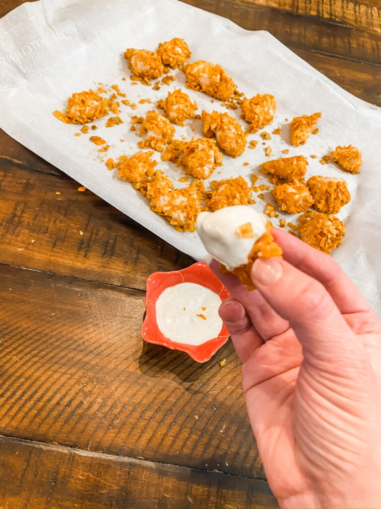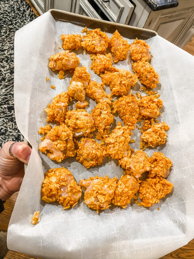 Ok mama, here is how I put this easy Dorito Crusted Chicken Bites for dinner together.