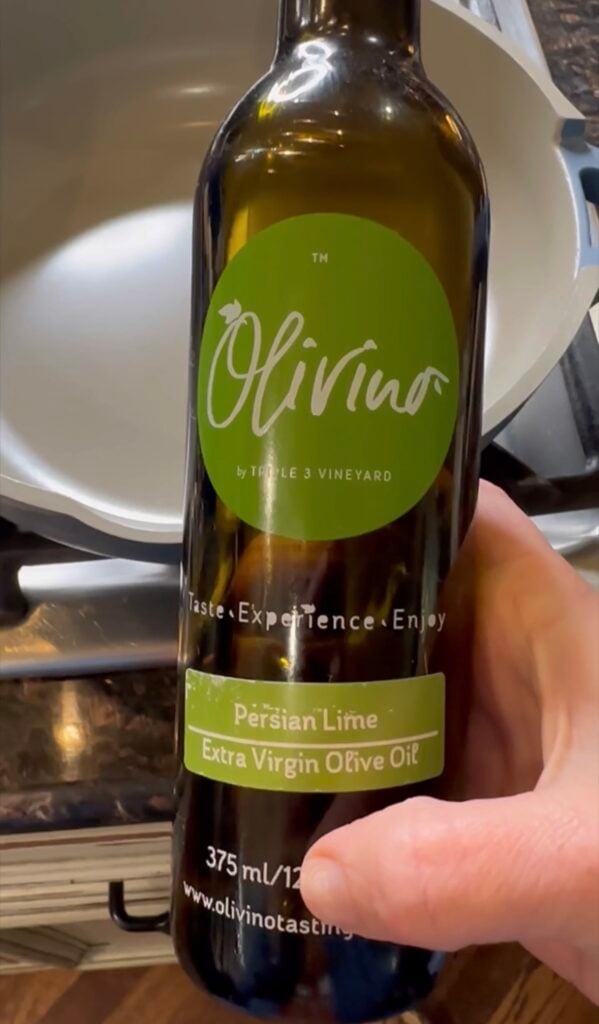 In a medium skillet add Olive oil – I am using Persian Lime Infused Olive Oil (game changer for flavor) in pan heat until sizzles