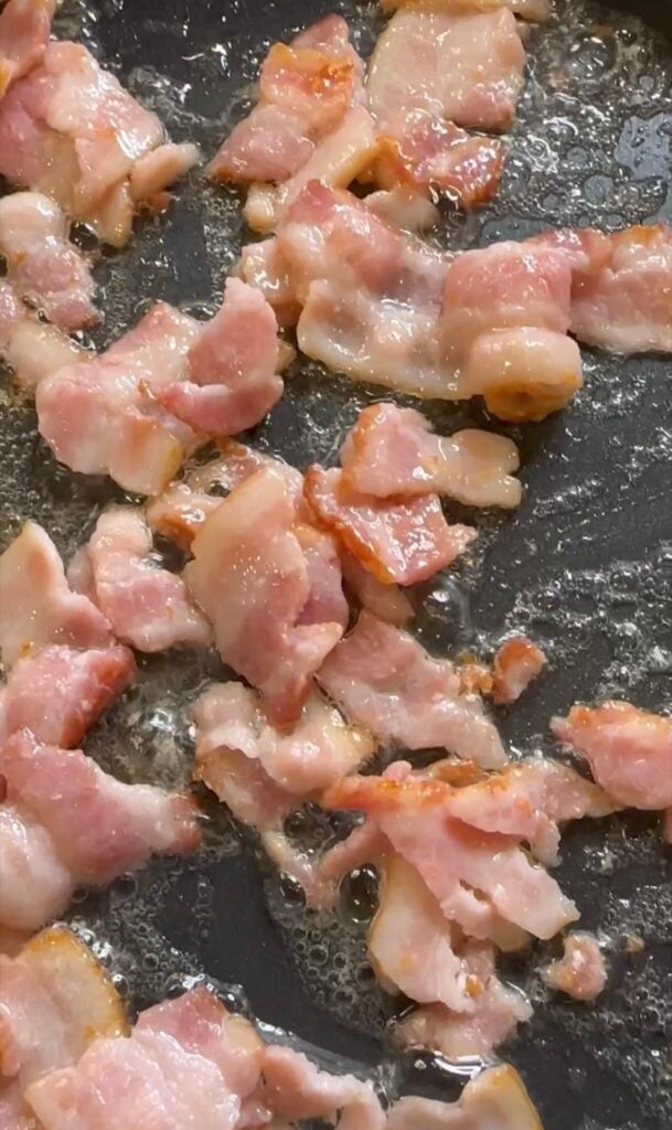 - In a medium skillet place chopped bacon I use kitchen shears to cut and cook bacon until crispy. Once crispy take out of skillet and place on paper towel to soak up excess grease