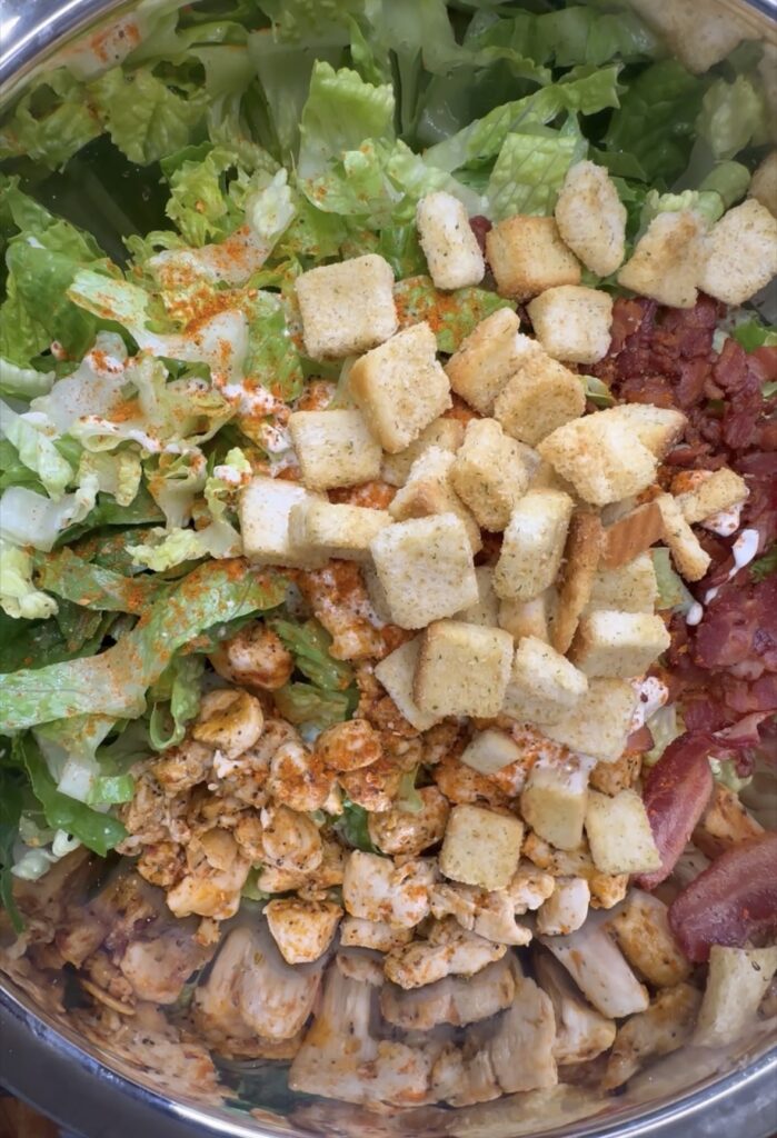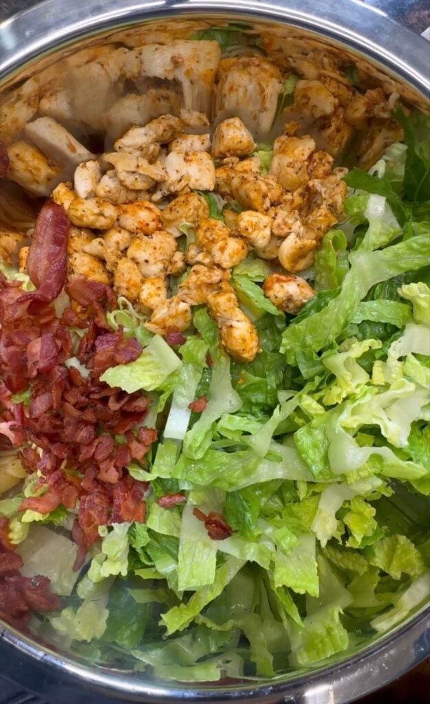 - Grab a large bowl preferably one with lid and pour fully cooked and drained pasta in large bowl, then add chopped lettuce, cooked and seasoned chicken, chopped and cooked bacon