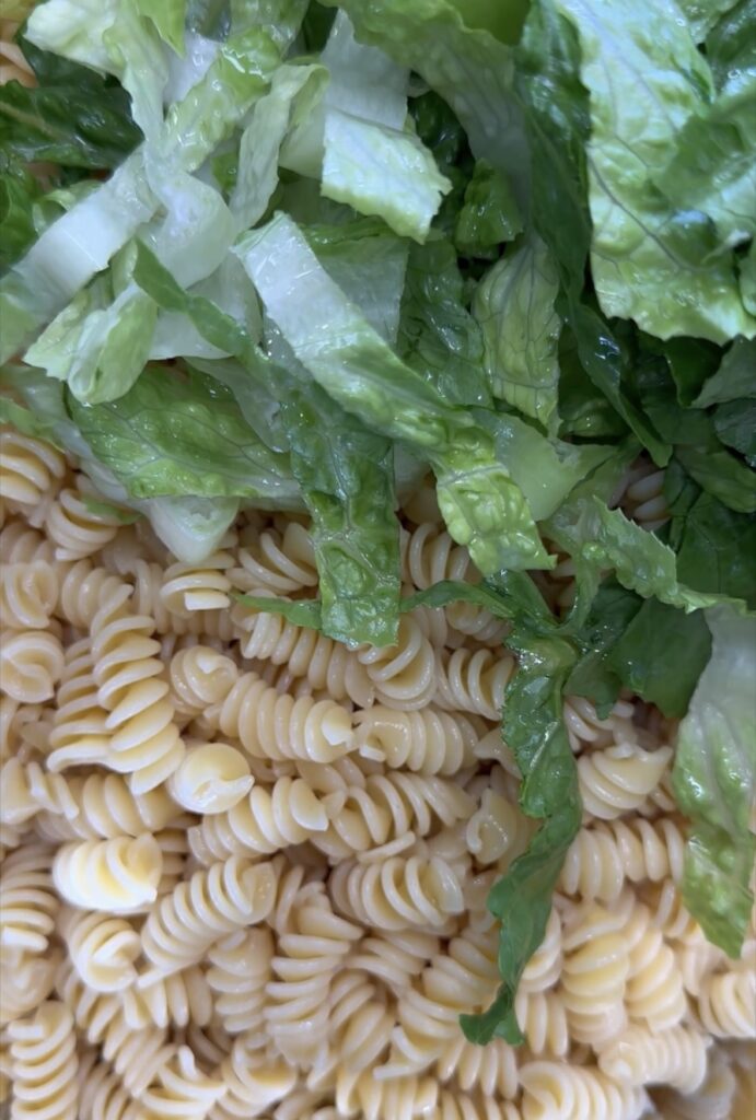 - chop up a head of romaine lettuce And once pasta is cooked drain and rinse with cold water