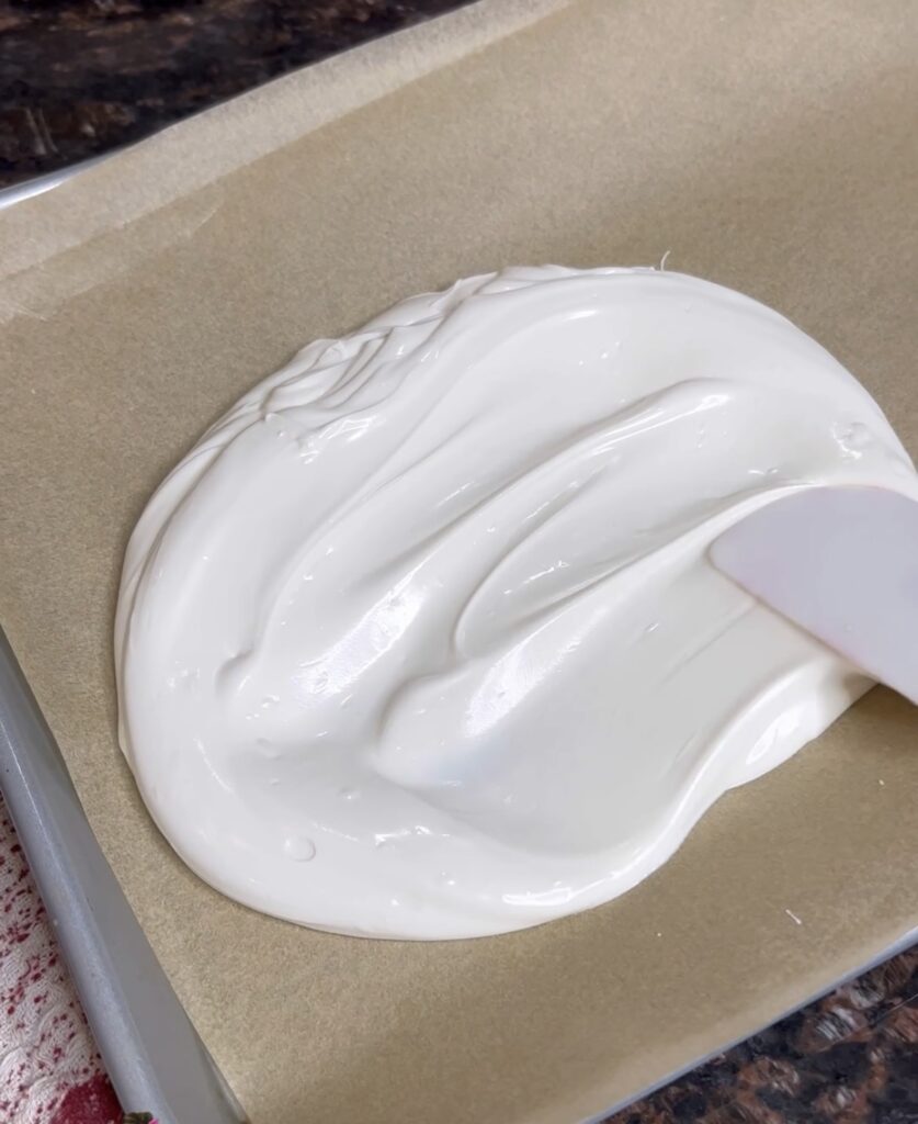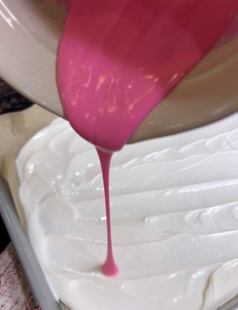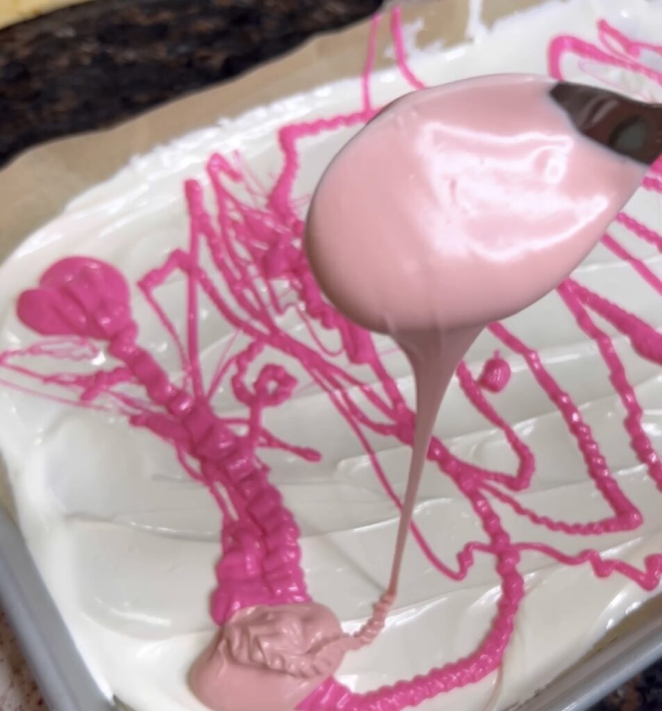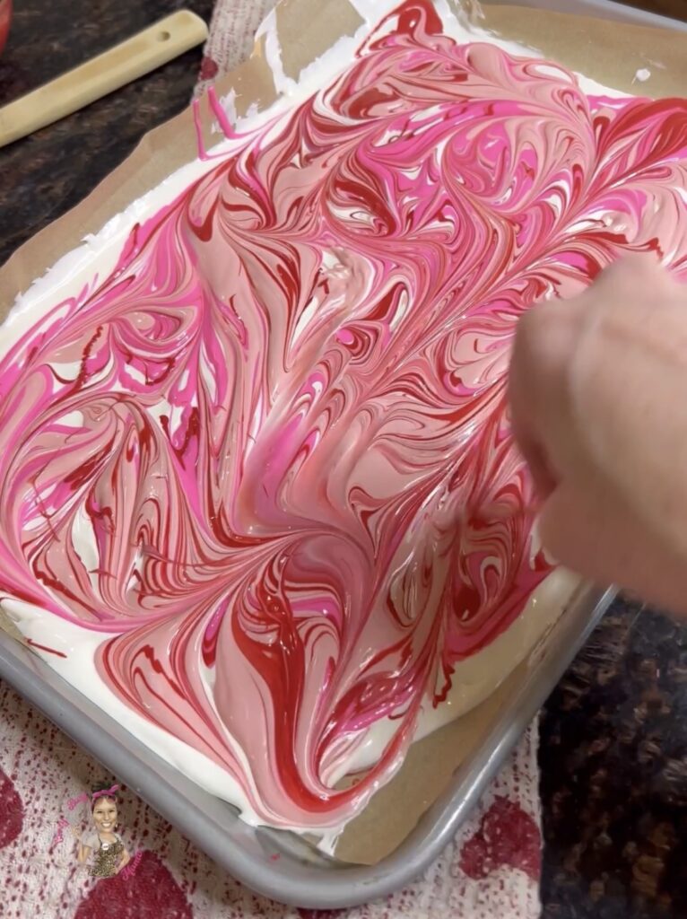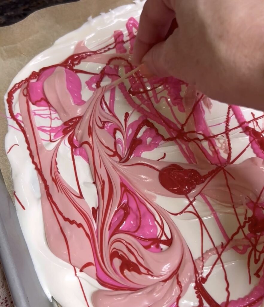 - Line sheet pan with parchment paper and start with the base chocolate then pour other colors on top. I wanted a white base and the colors to be swirled in.