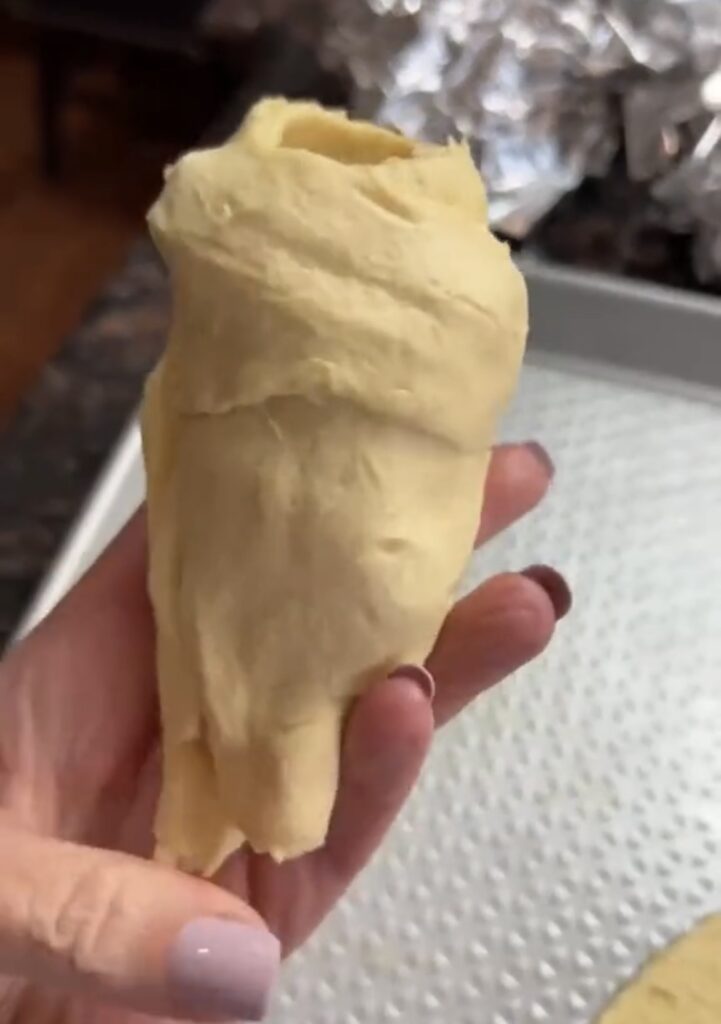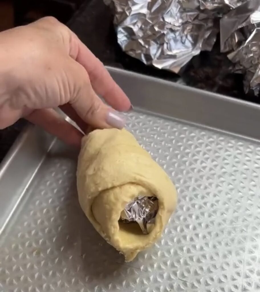 - Take 2 crescent triangles and flatten then place foil ball into each and roll up around the ball leaving the top open and bottom closed.