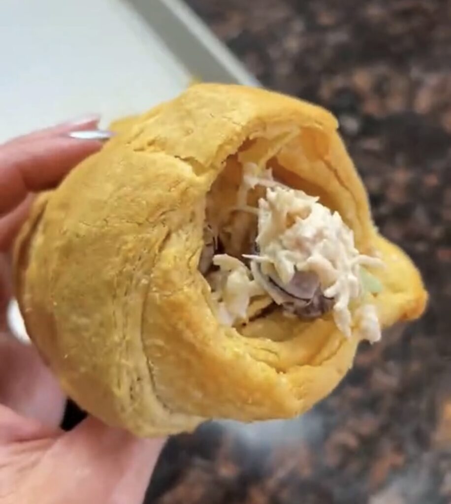 - Once cooled and foil is out take a spoonful of chicken salad push down to bottom filling the crescent carrot up.