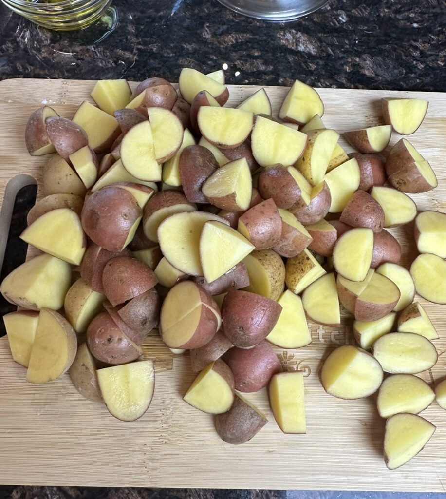- Take baby potatoes and dice them up. I like to cut them in half but you could cut them in fourths. (keep in mind, they will cook up much quicker if cut smaller)