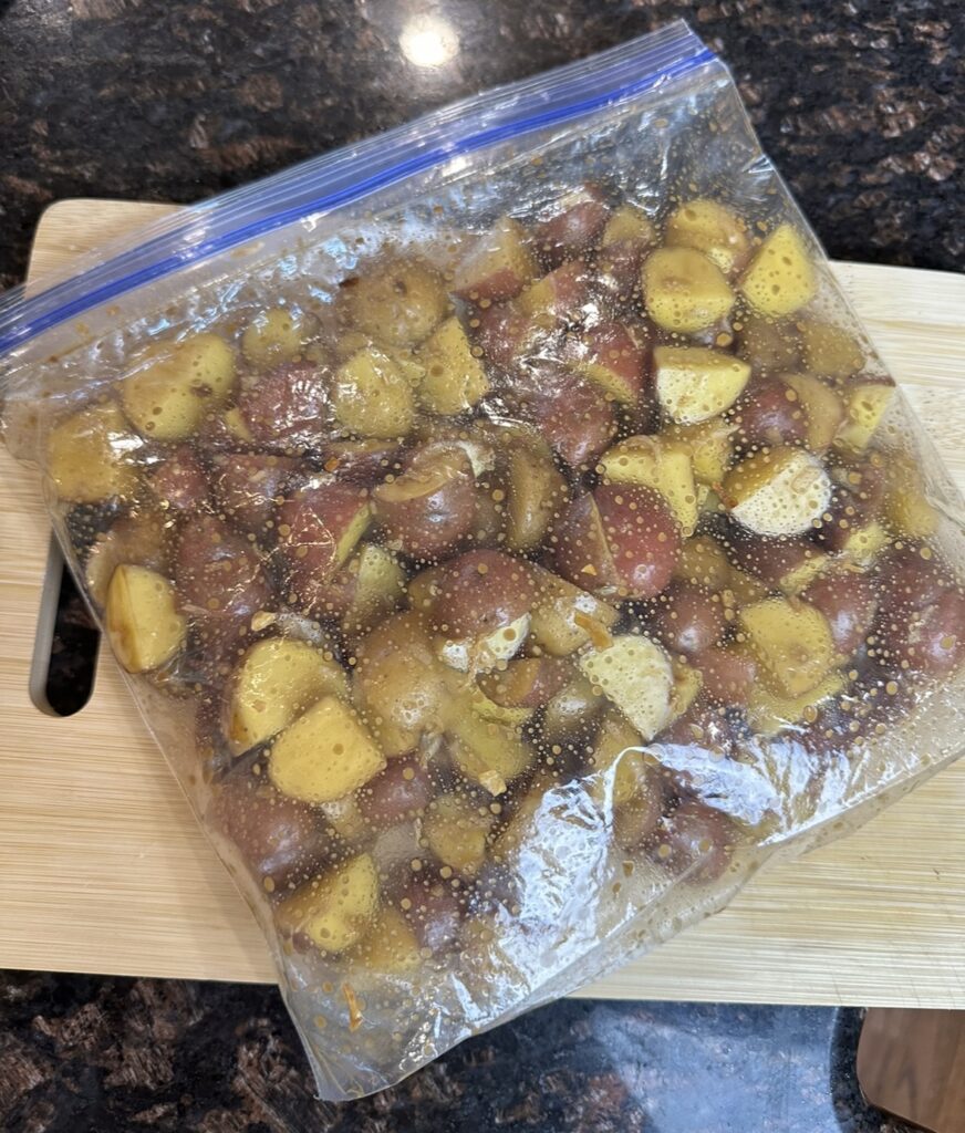 - Then take those potatoes and place them in a ziploc bag and add olive oil and shake to coat the potatoes
