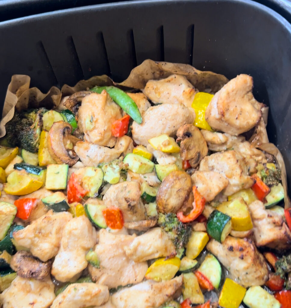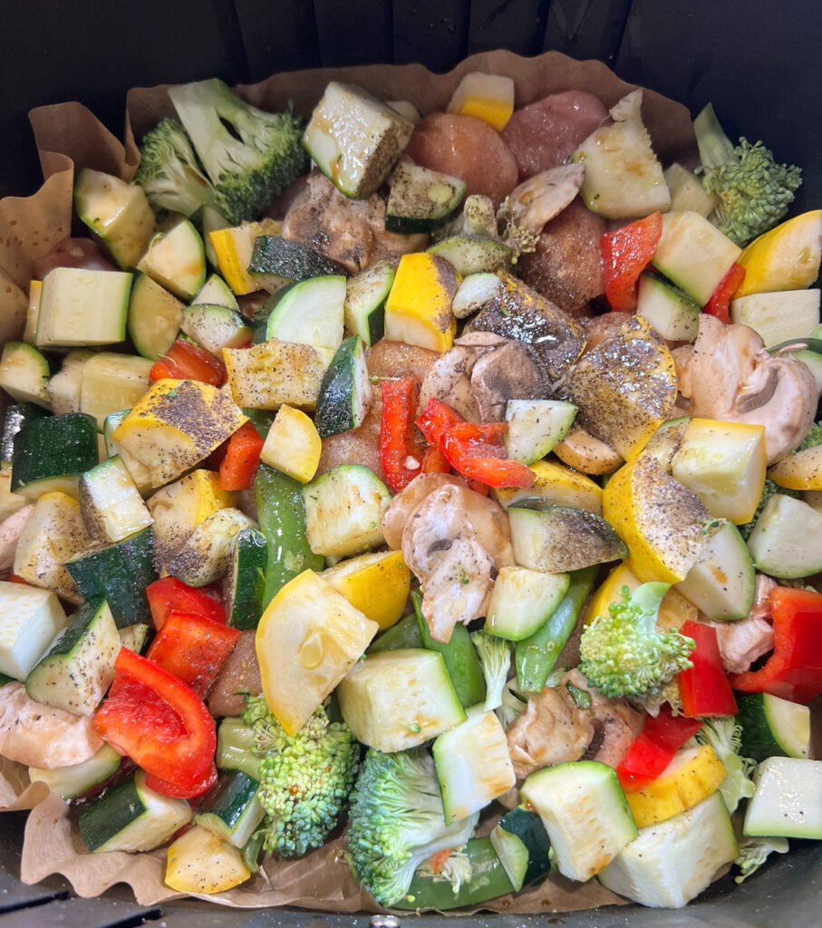 - Shake and stir up all ingredients in air fryer to make sure all veggies and chicken are coated with all the seasonings