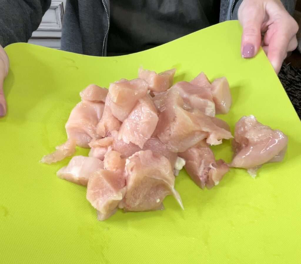 Take 2-3 chicken breasts and chop into cube size pieces. I like to do this with my kitchen sheers