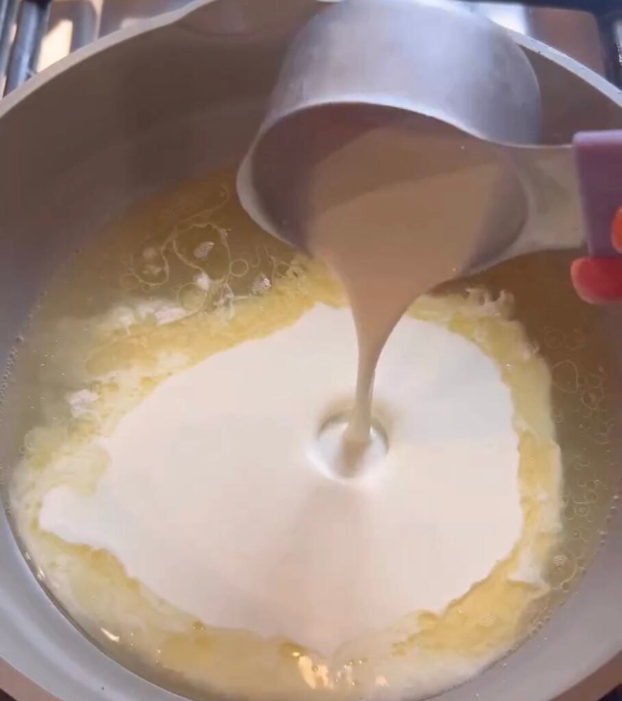 Add chicken stock, heavy whipping cream and ranch seasoning to that bacon grease whisking together once combined add softened cream cheese blend well and allow to come to a simmer but not boil. This will make the sauce for the dish.