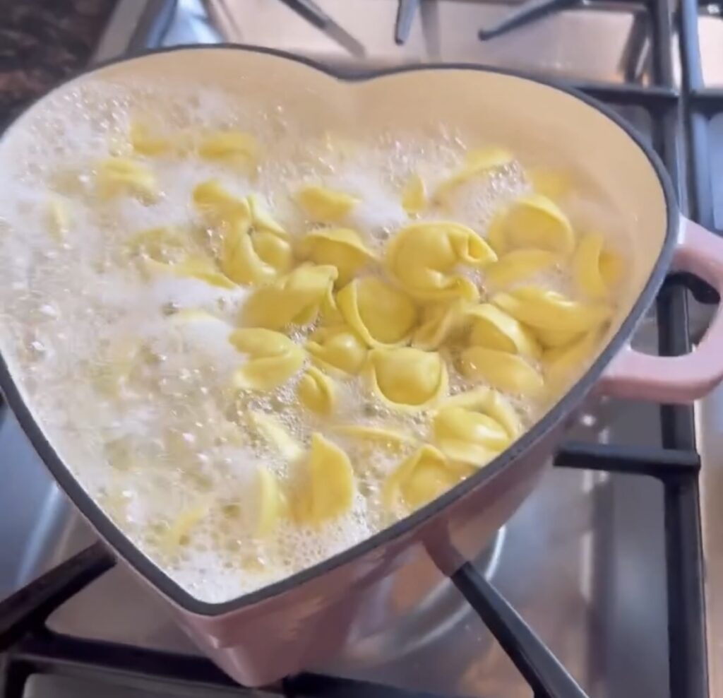 - Once water comes to a boil add tortellini. Tortellini cooks super quick like 3-4 mins max. Once done strain the tortellini