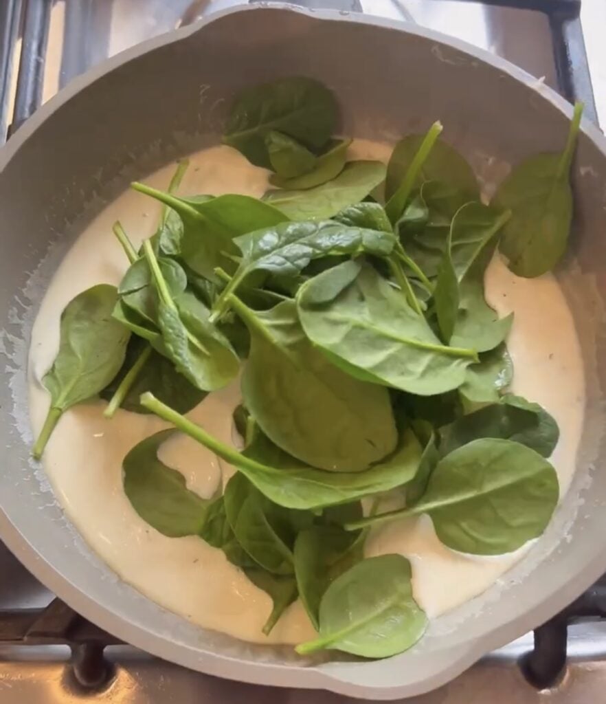 - Once the cream sauce is well combined. Add a few hand fulls of fresh spinach – no need to chop if you don’t want to because these will wilt down when cooking.