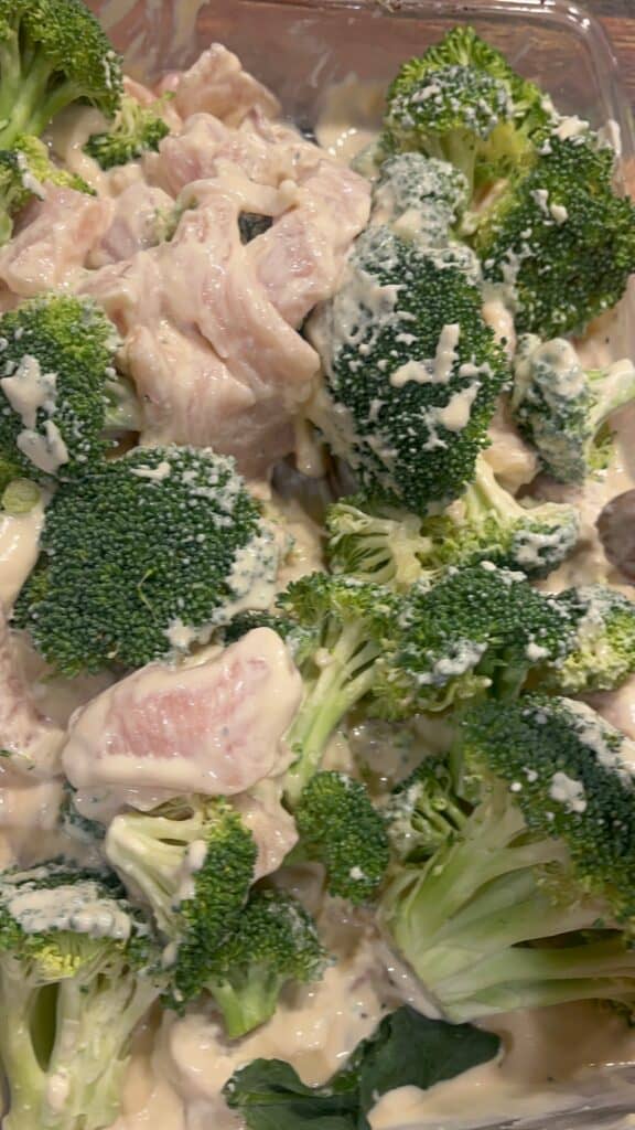 Pour the Alfredo sauce evenly over the chicken and broccoli.