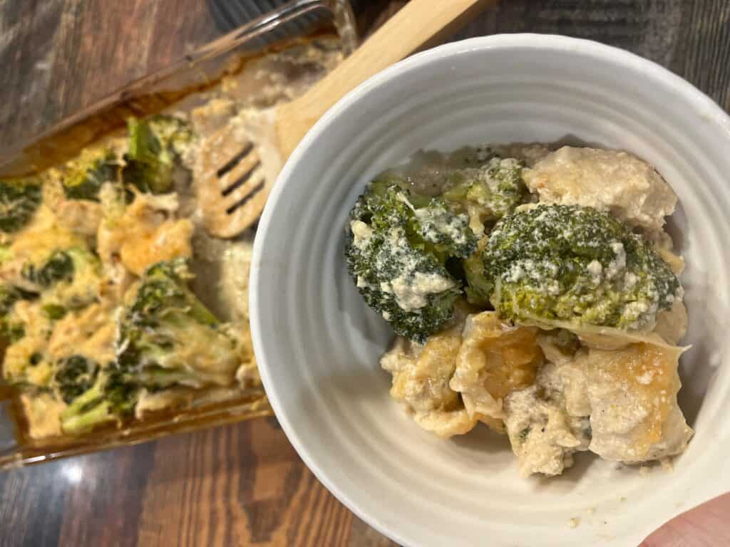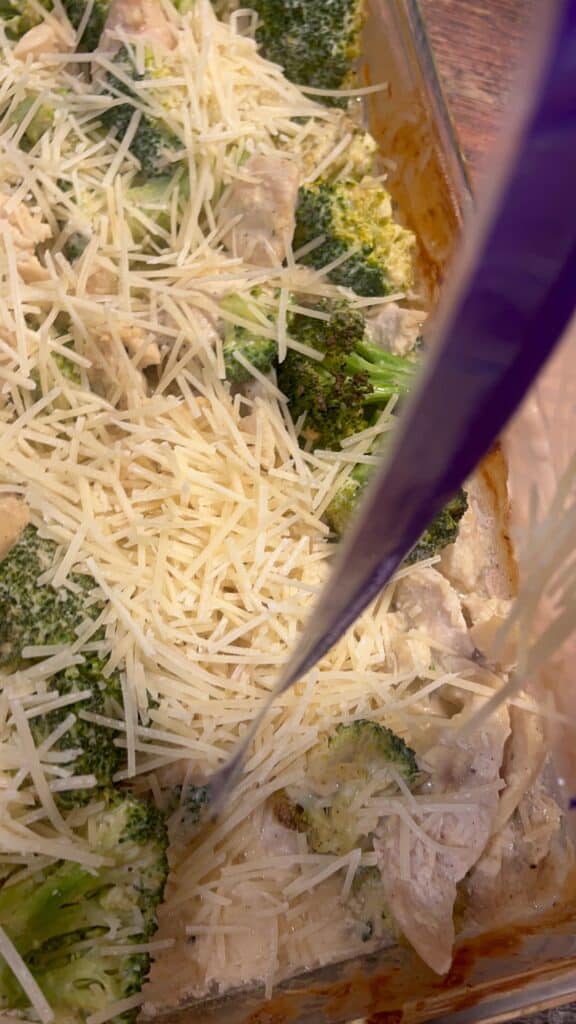 Cutting the chicken into bite-sized pieces helps everything cook evenly and keeps the bake tender and juicy. Fresh broccoli adds texture and balance to the creamy Alfredo sauce, but you can always adjust the amount to fit your family’s tastes.