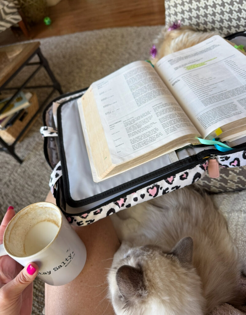 Here is a picture of me in my time with the Lord with my hot cup of coffee and two of my amazing fur babies Ditto and Apollo Sky . Apollo is our grief kitty we adopted for my sweet youngest daughter to help with the struggle of looking her father. If you want to read why Apollo Sky, READ HERE