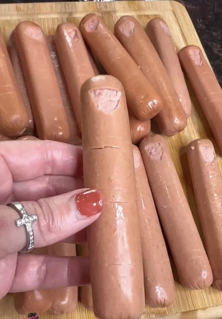 - Slice a third of the way through the hotdog 2 slits towards top 3 in the middle and 2 towards the bottom. This will resemble the knuckles of the finger