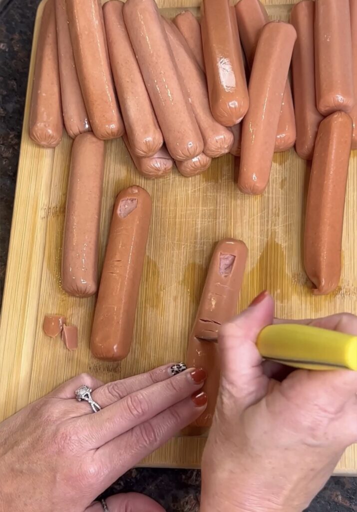 - Place each hot dog on a cutting board and cut towards the top the letter U and cut it out just enough to take the skin of the hot dog.