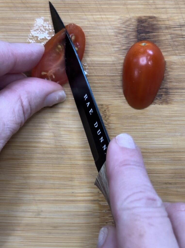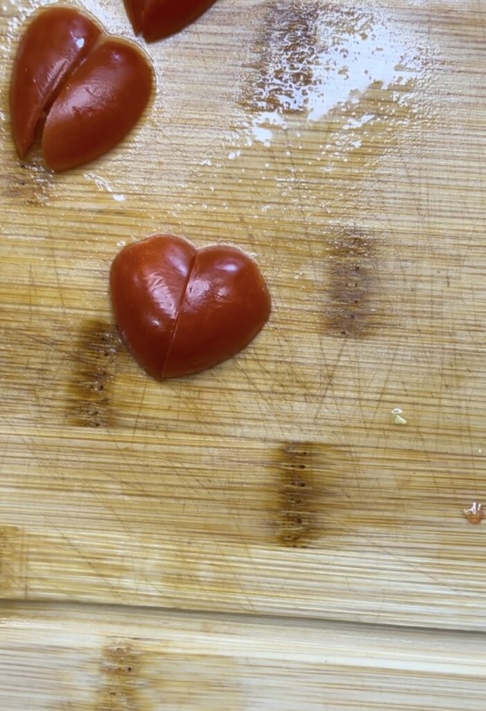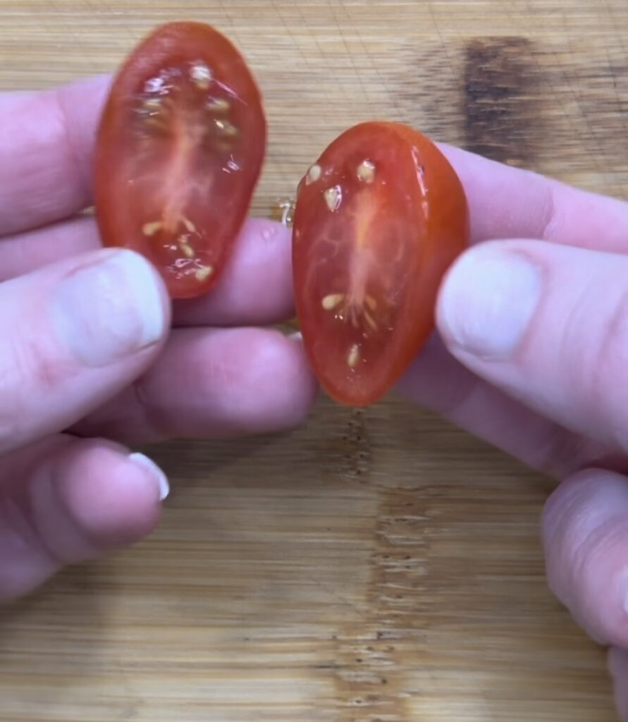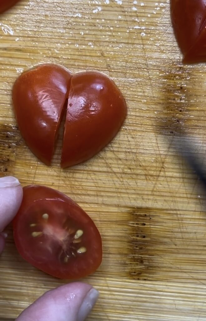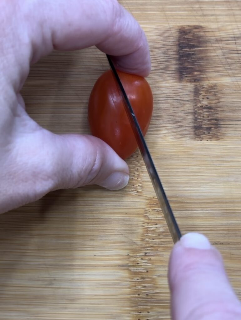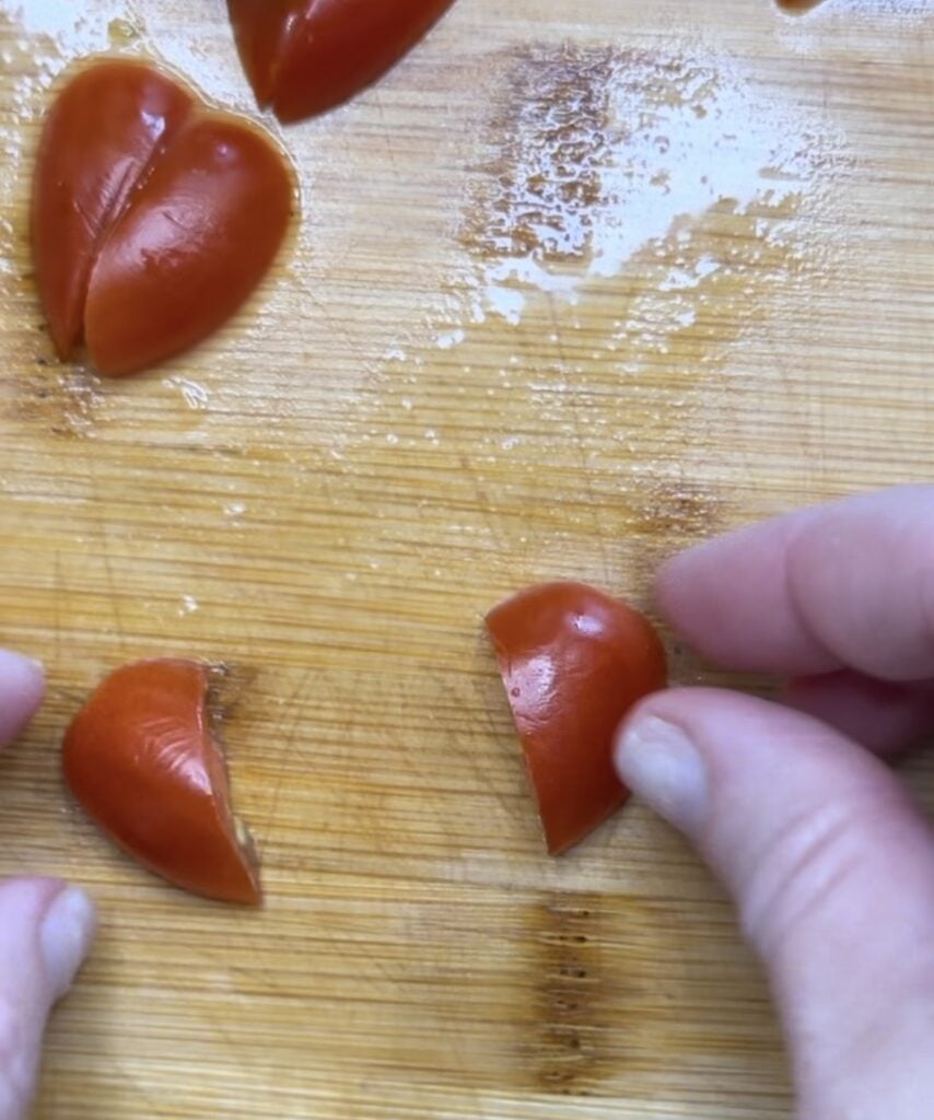 - Rinse and drain tomatoes and take each tomato and slice in half diagonally then take each half and slice in diagonally half again.
