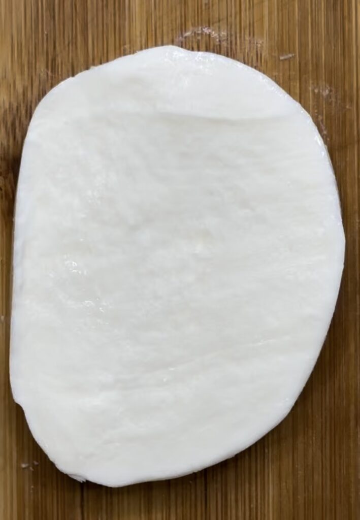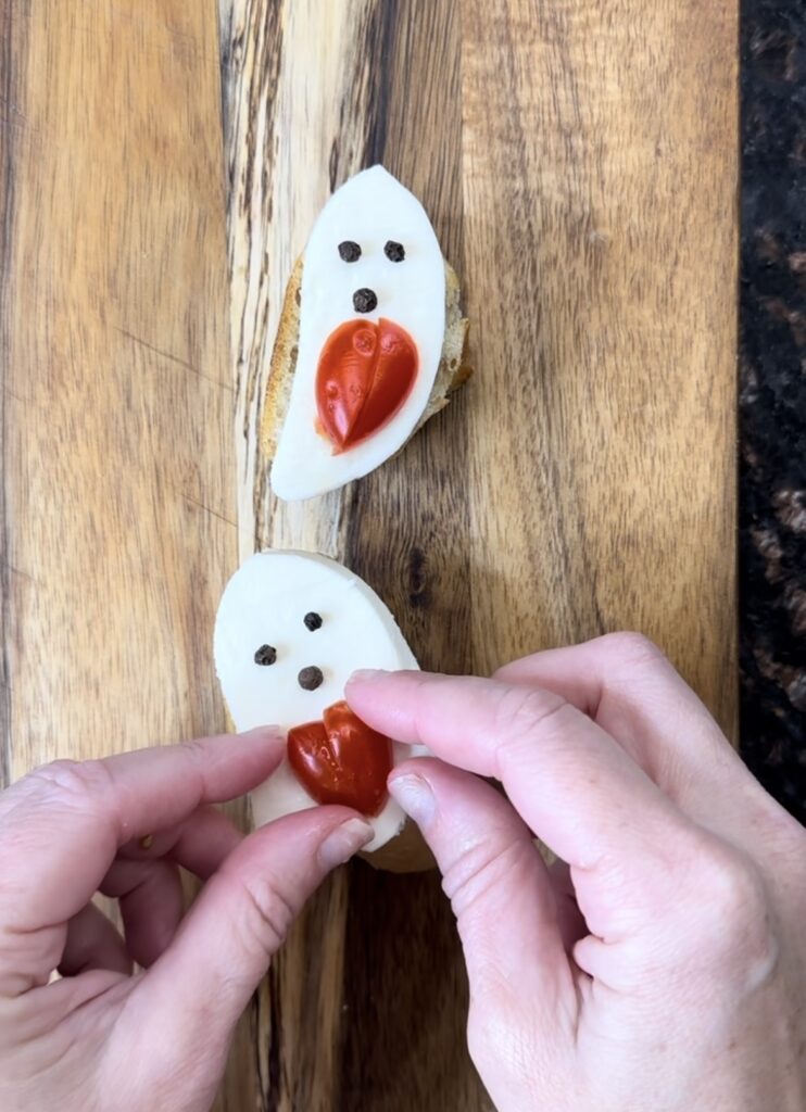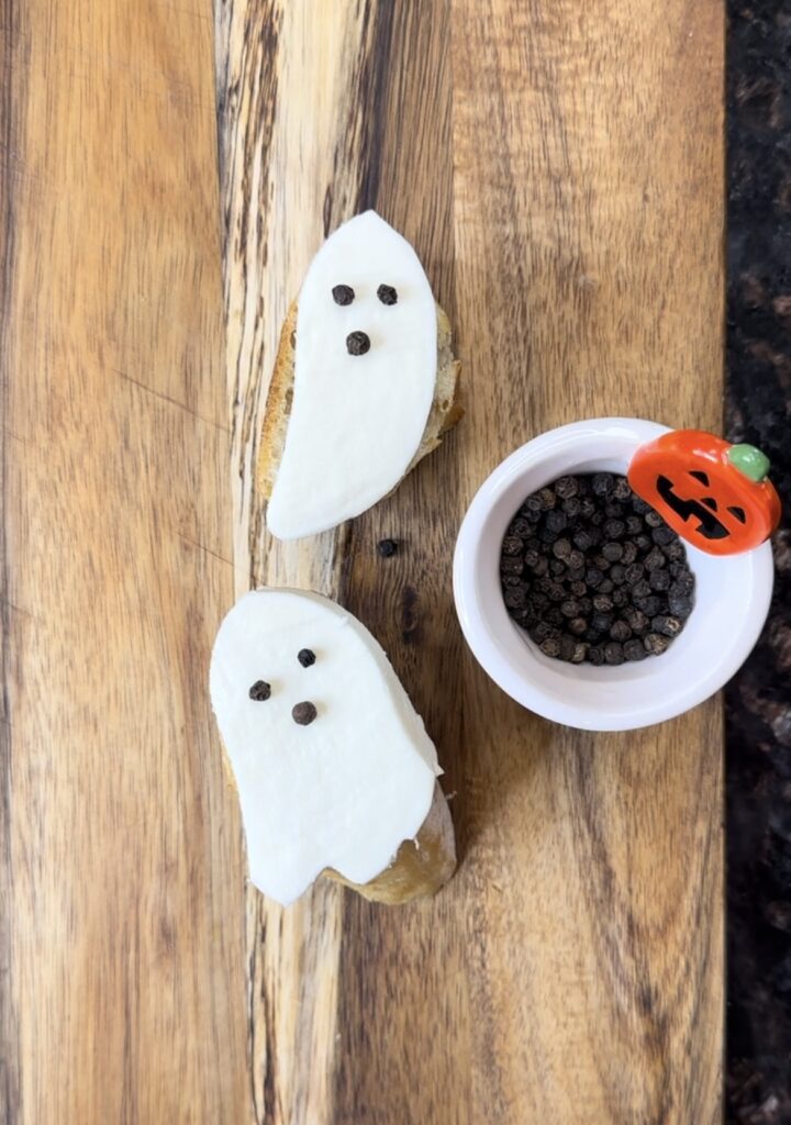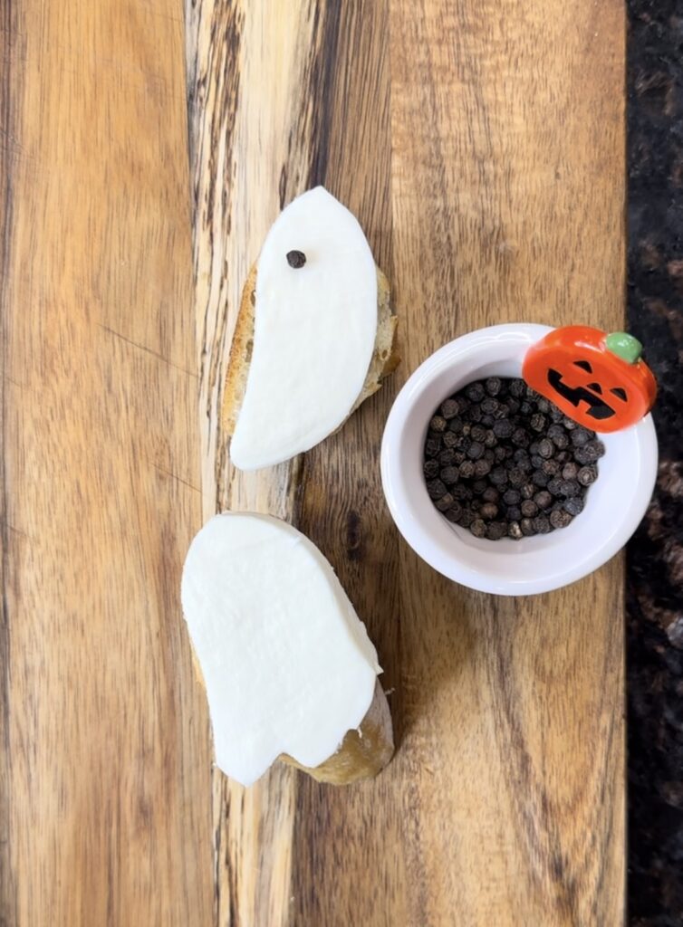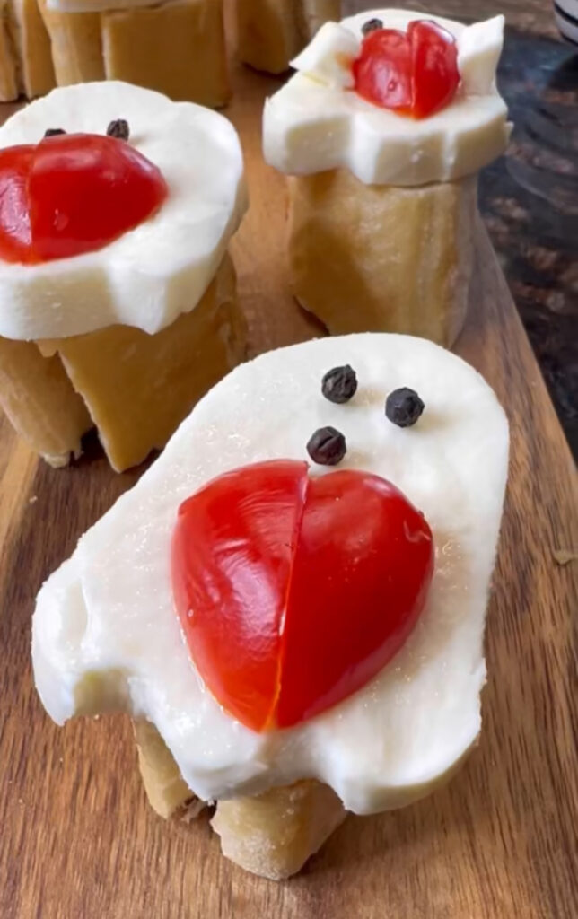 - Take the mozzarella slices and place them on the cutting board and take a ghost cookie cutter and cut each slice – enough of them to cover the bread you sliced. I had a bigger ghost cookie cutter so I moved it to fit (like you see in the video) the cheese creating a smaller ghost figure. Keep scraps and set them aside.