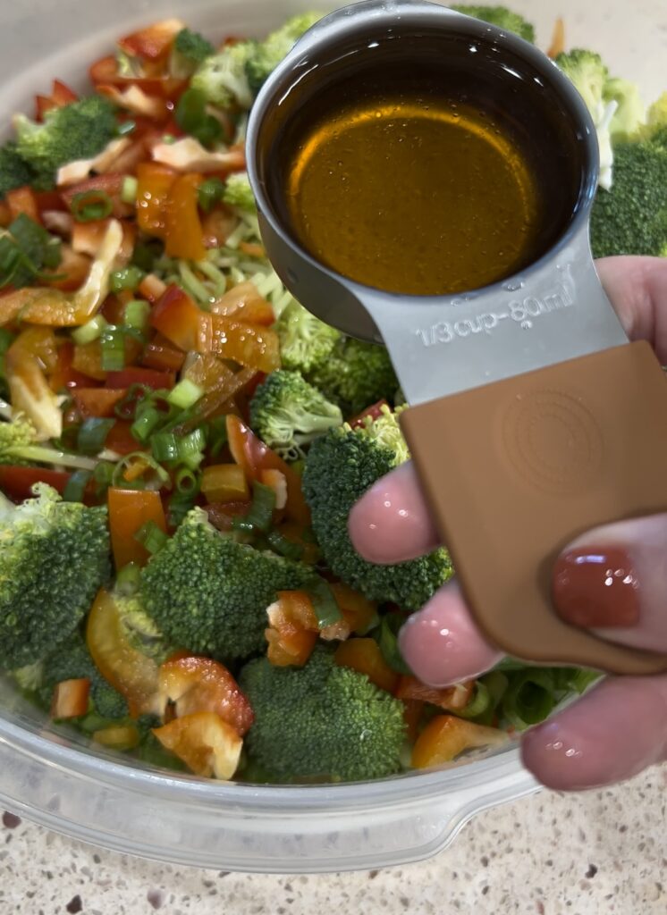 - Once dressing is combined and mixed well add to top of the veggies and mix well.