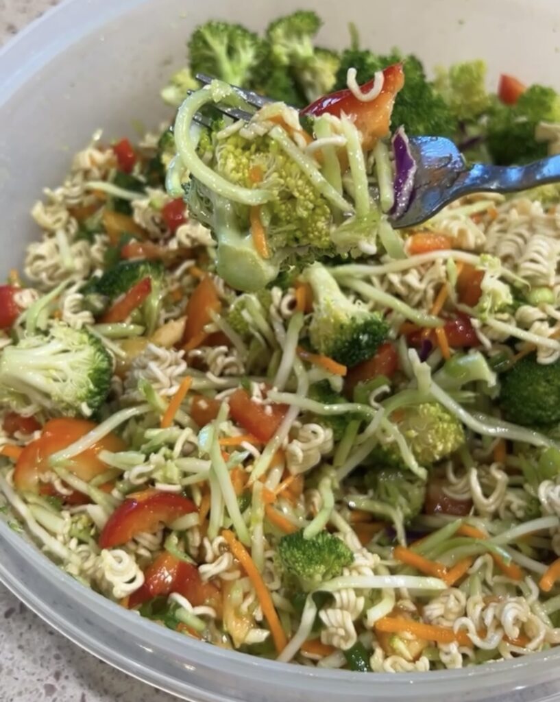 I only put as much of the crumbled Ramen noodles in the salad as we will eat at the time. The salad can sit in the fridge for several days– but you don’t want the noodles to get soggy.