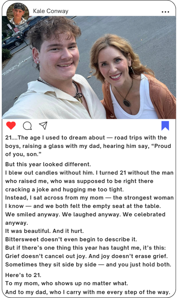 After celebrating with family, Kale and I took a special mother-son trip to Nashville to mark the occasion. We ate good food, listened to live music, and just soaked up time together. It wasn’t the trip he imagined having with both his mom and dad, but it was meaningful in its own way. We laughed, we remembered, we dreamed forward. And in every step, we carried his dad with us.