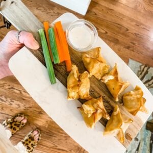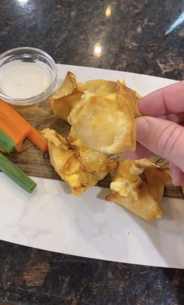 Mix all above ingredients together and then take each wonton wrapper and wet each side with water. I usually keep a small bowl of water that I can dip my fingers in and wet each side. Take a spoonful of mixture and place in center of wonton wrapper pinch up sides together and the wetness will allow them to stick together. Once you have the wonton wrappers stuffed  with mixture and pinched up on sides they are ready to be placed in the air fryer. If you don't have an air fryer and are looking for one, this one has thousands of amazing reviews https://amzn.to/47bRVhb The one I have shown in video below has been discontinued but the one linked is very similar to mine. Air Fryers are a perfect way to enjoy fried foods without all the fried and are much healthier for you! With a house full of teens use ours daily!