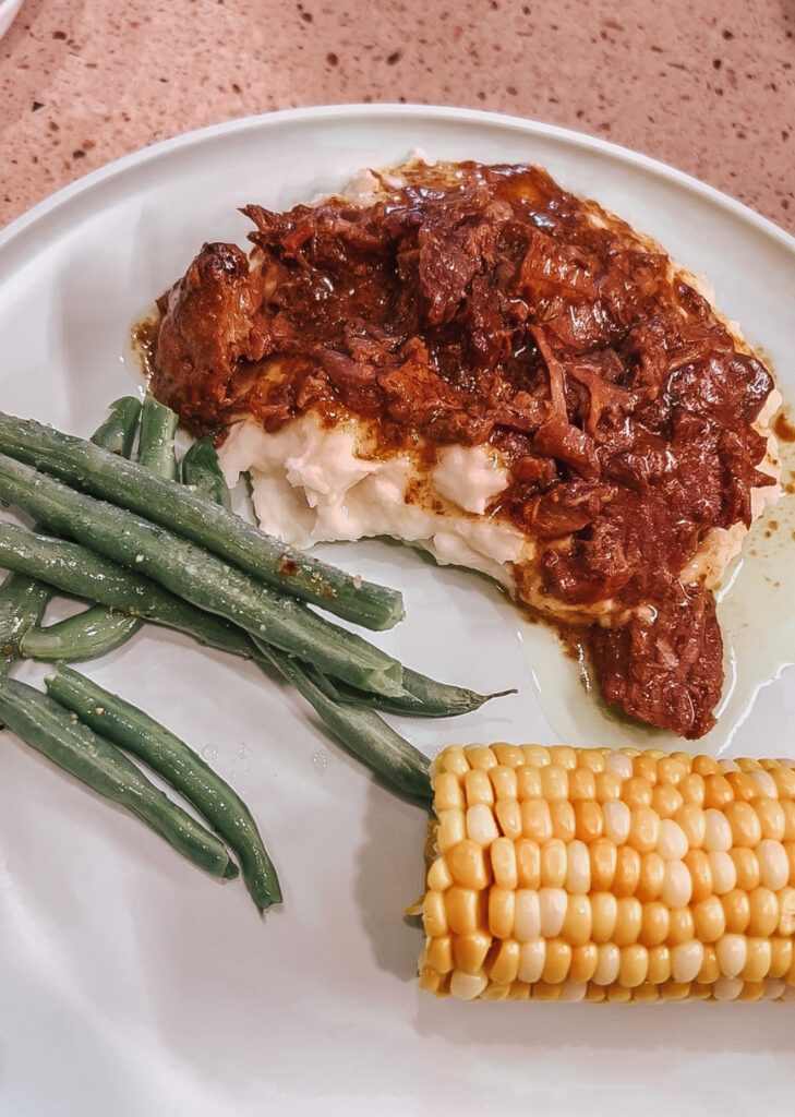 *When I make this I will occasionally add in carrots about an hour before you are ready to eat. This recipe is absolutely delicious served over mashed potatoes or rice! It also goes great with a side of green beans!