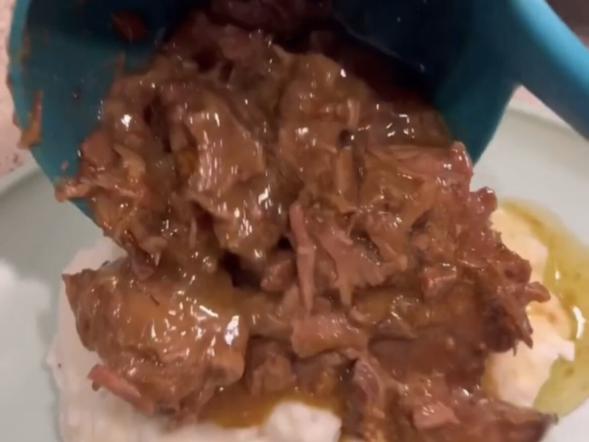 I saw this on Lori’s Facebook stories yesterday and ran to the store to buy a brown gravy packet! I bought a 3 pound pack of beef stew meat at Sam’s last month and split it in half so I had about a pound and a half in my freezer. I pulled it out yesterday tossed this in the crockpot this morning. It literally took 3 minutes. I also only used a half stick of butter and added a little beef broth. It took about 3 hours to cook and my house smells amazing!! Can’t wait to eat this over some mashed potatoes tonight when I get home from work!!