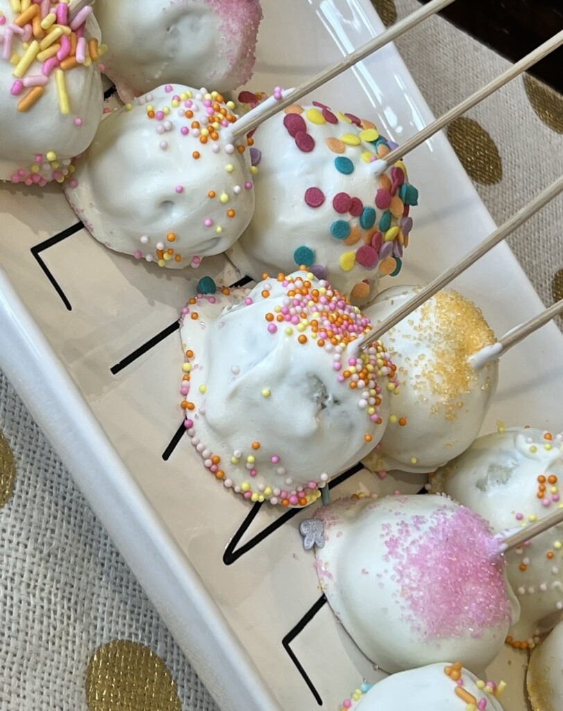 Love cake pops because you can use a variety of sprinkles that go with any holiday, birthday or entertaining theme. You can also use any color of chocolate melts.You will want to store these in a cool dry place like in the refrigerator. Take one out as you want to enjoy!