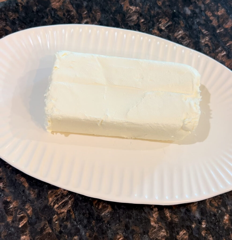 I like to place my dip on a small platter plate to serve. You could even use something festive for the fall too! Make sure your cream cheese is softened room temp.