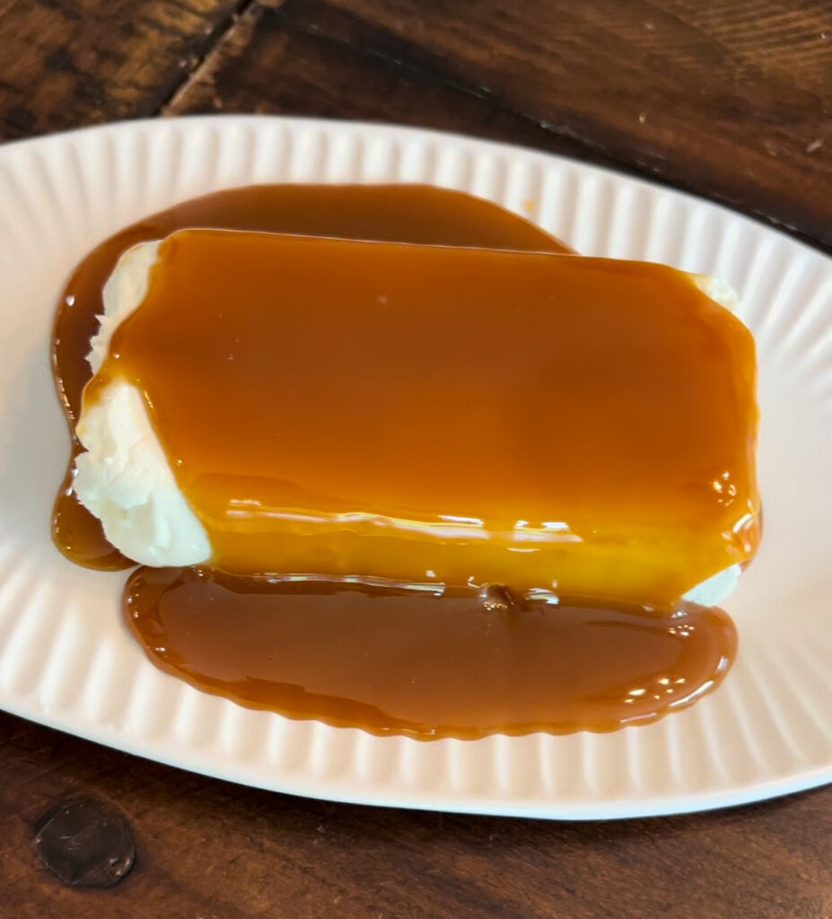 - Take a softened brick of cream cheese and drizzle caramel syrup over the top of the cream cheese once completely covered then take the heath toffee bits and cover on top of caramel with them.