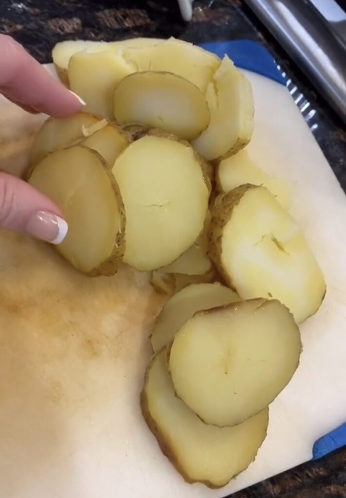 - Take 2 baked potatoes and slice scalloped style and layer on a greased 8X8 casserole dish
