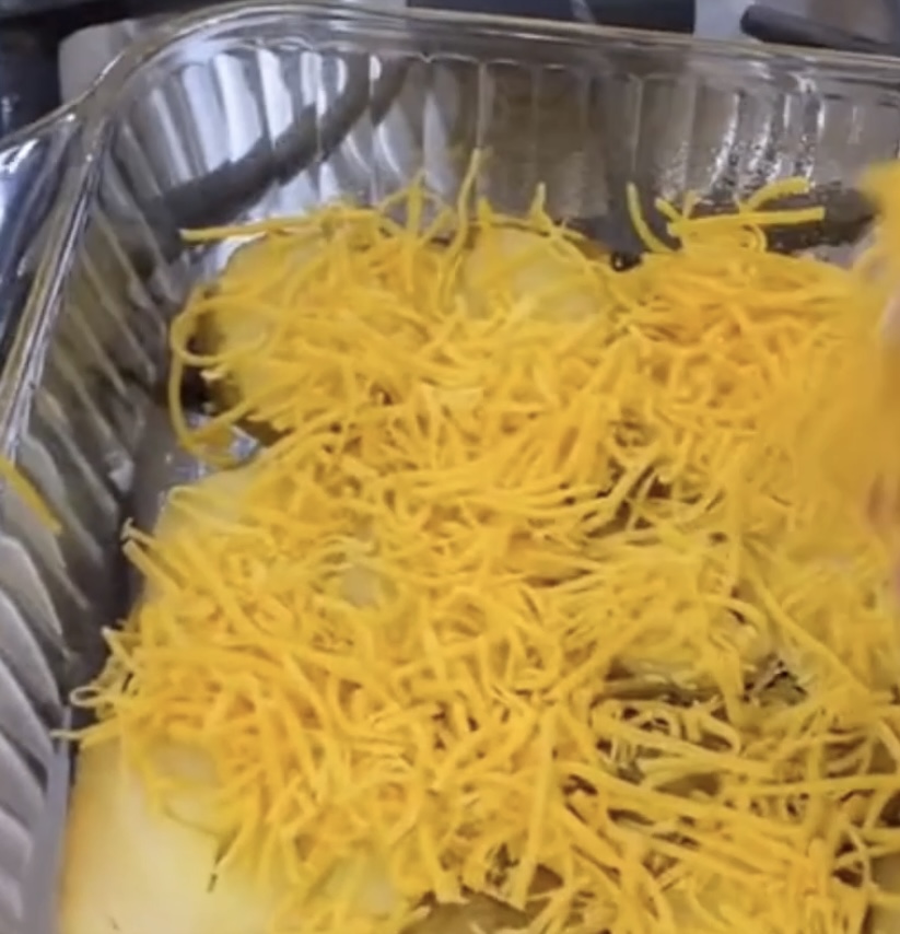 - Shred 2 cups of cheddar cheese and use 1/2 cup of cheese on top of the potatoes