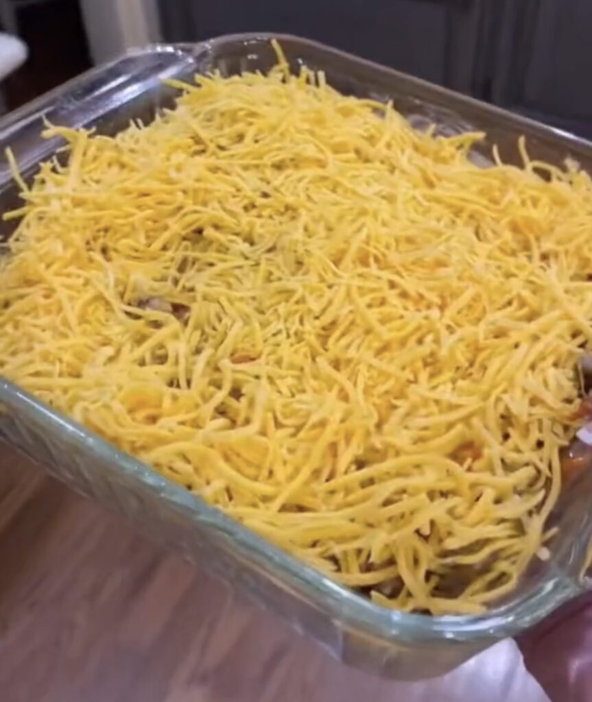- Once meat mixture is done add to the top layer of the casserole dish