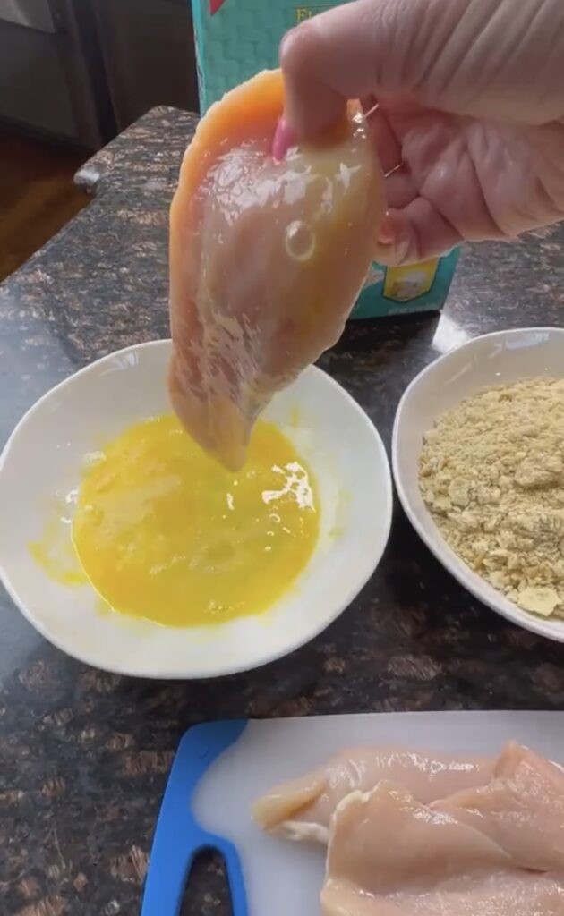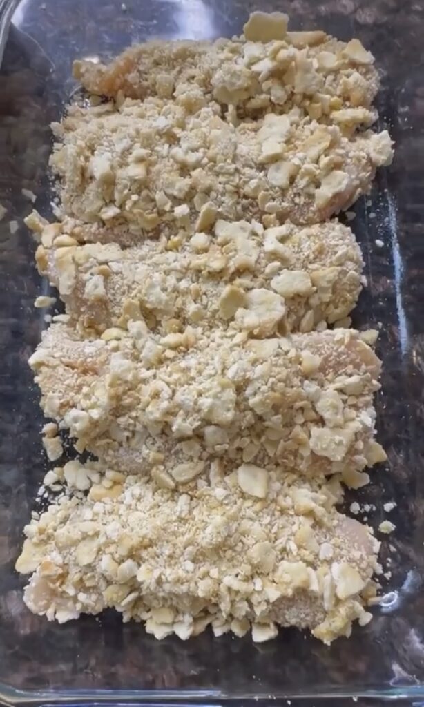 - Dip one chicken breast at a time in the eggs coating well, then dredge in the cracker crumbs, coating well on all sides. *better breader container will make this virtually mess free.