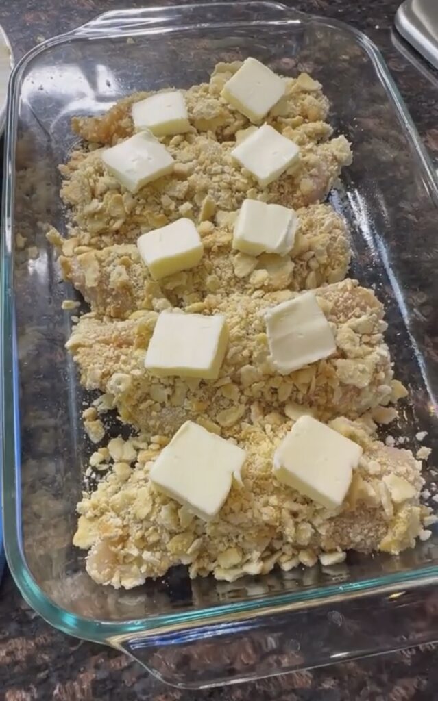 - Cut butter into individual slices and top chicken evenly with pieces of butter.