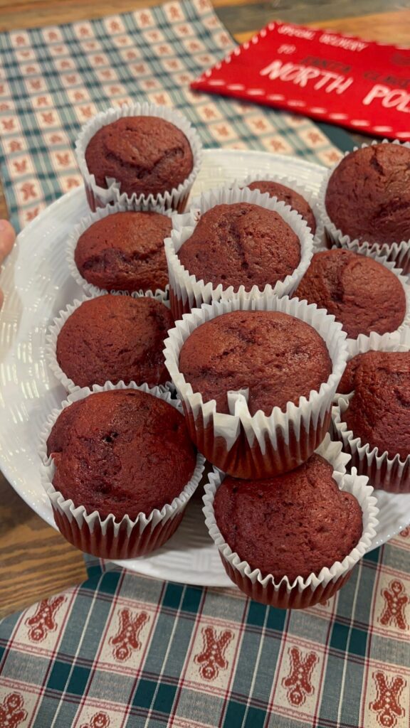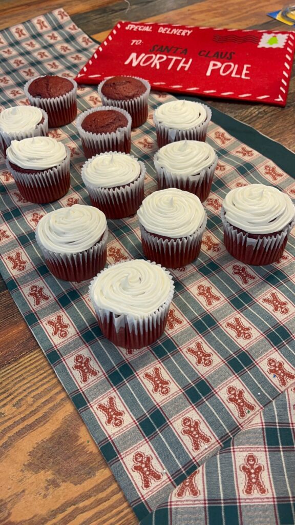 Prepare the red velvet cake mix according to the package instructions. Line a muffin tin with festive cupcake liners, then bake as directed. Once baked, let the cupcakes cool completely—this is key before frosting, or the icing will melt.