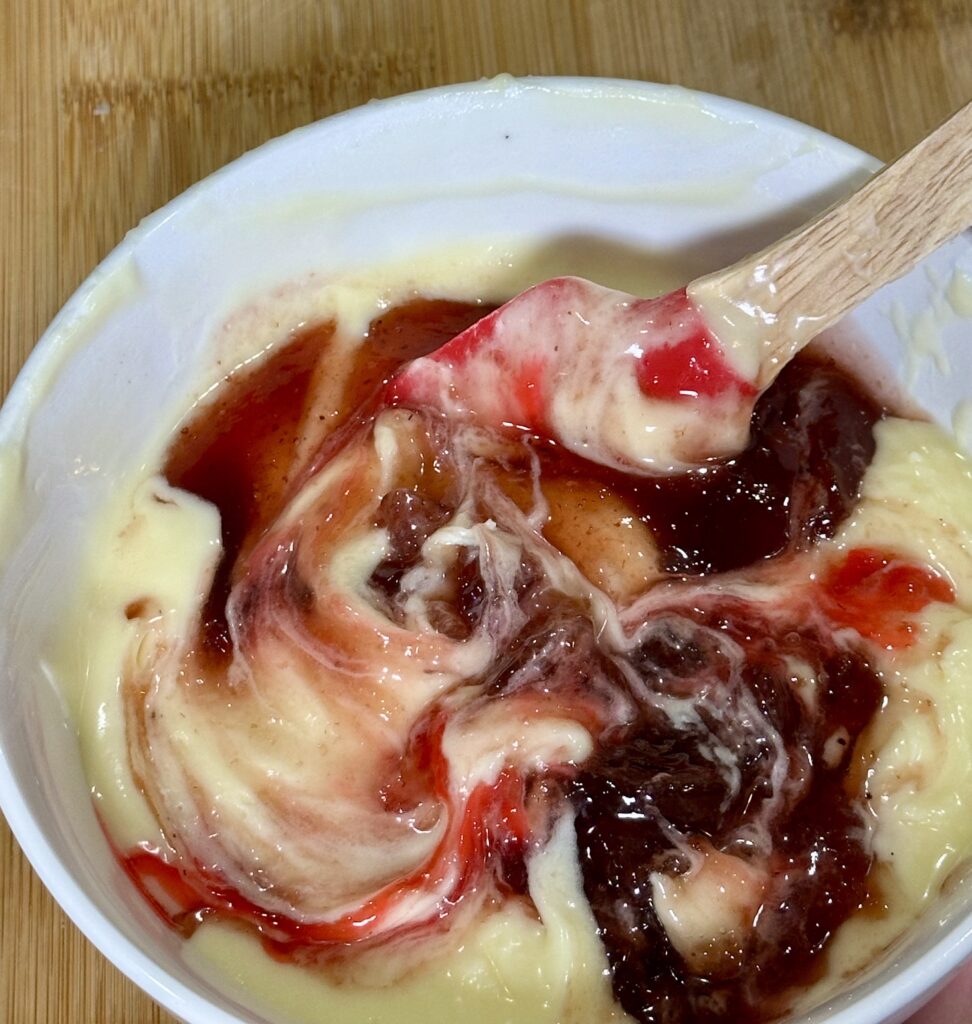 While the rolls bake, empty your icing containers into a mixing bowl. Whisk together with strawberry jam and a little red icing until it looks deliciously spooky.