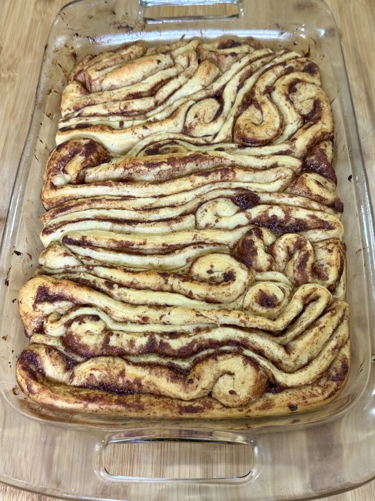 Unroll your cinnamon rolls and twist or squiggle them into the casserole dish so they look like “intestines.” Don’t stress about perfection—the messier the better!