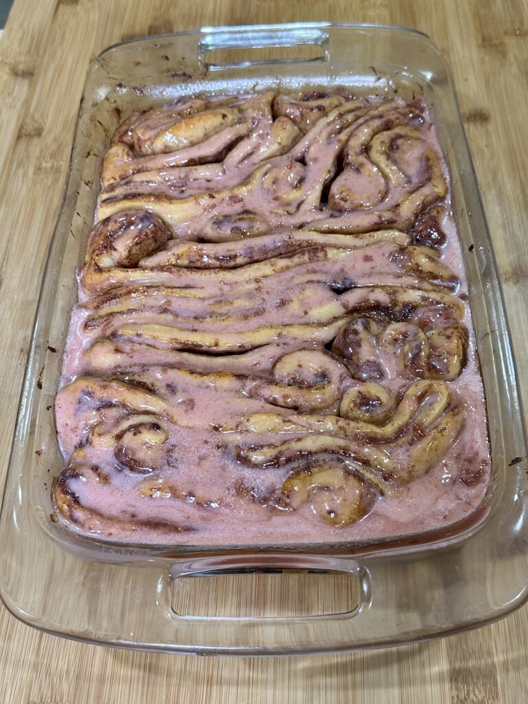 Preheat your oven to 350°F. Grease a casserole dish so your cinnamon rolls don’t stick.