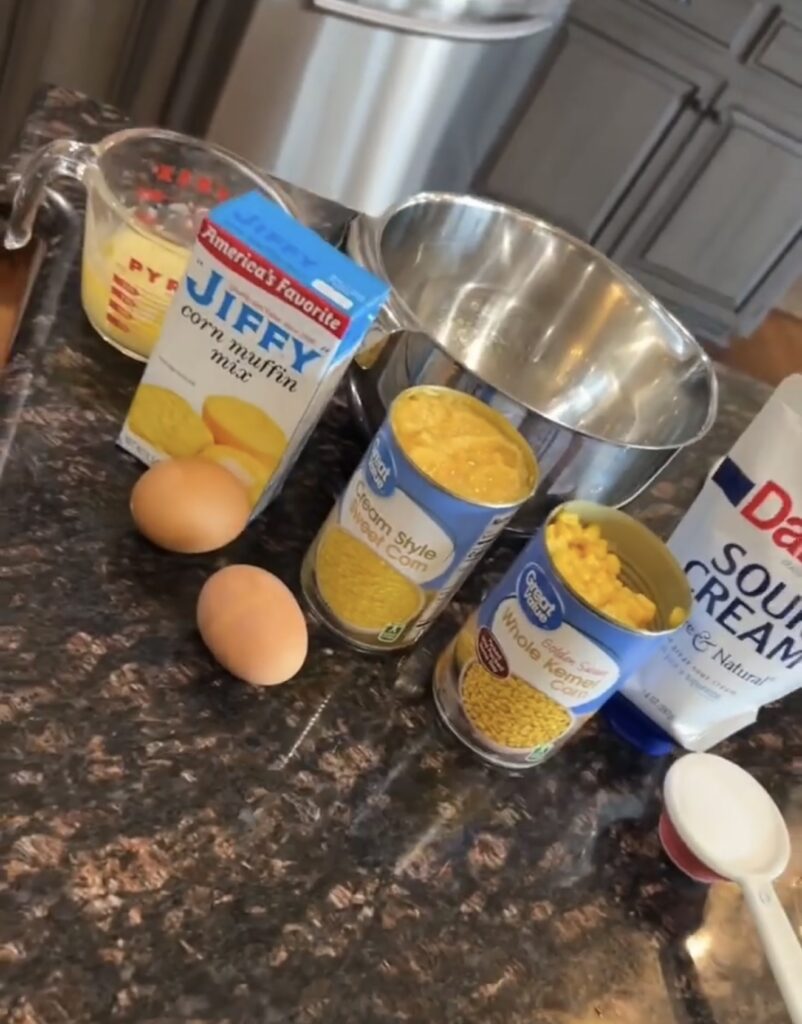 - In a medium bowl combine wet ingredients- eggs, Sugar, sour cream. Make sure to drain the whole kernel corn.