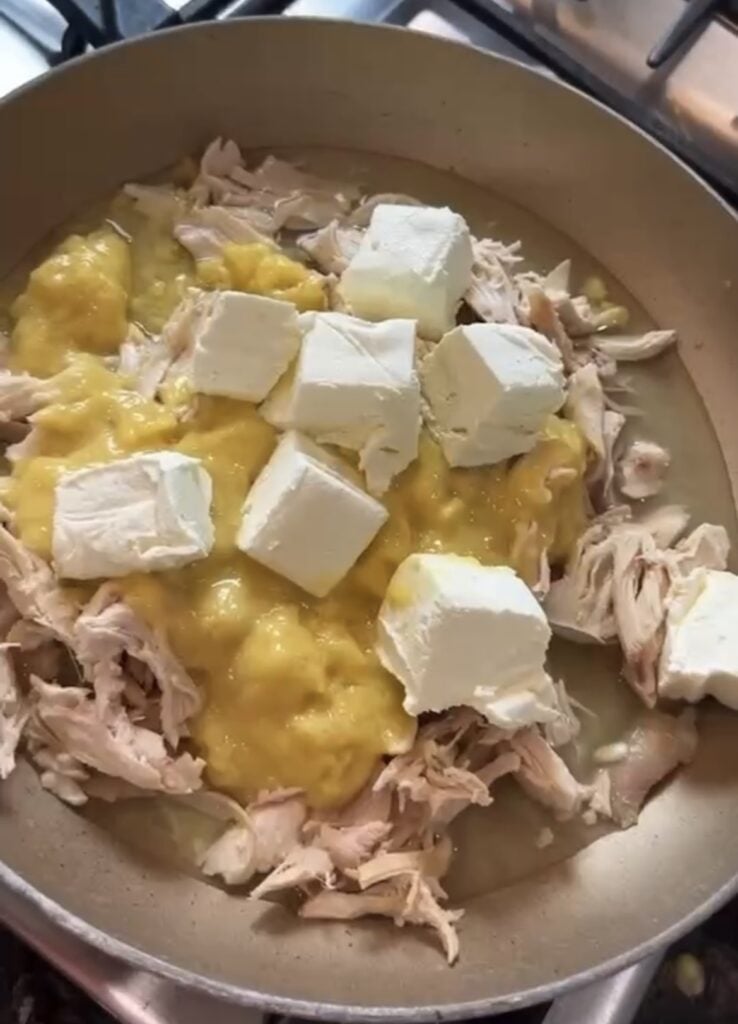 • Shred rotisserie chicken and place in a large skillet over medium heat