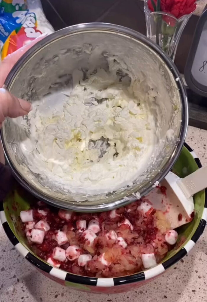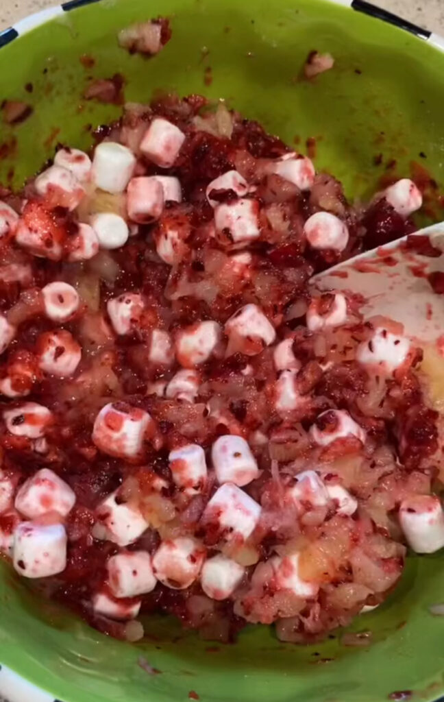 This dish needs to sit in the fridge overnight. So make it, stick it in the fridge, stack and run the dishwasher. Then when you wake up, you will have a clean sink and Cranberry Fluff marked off your list!