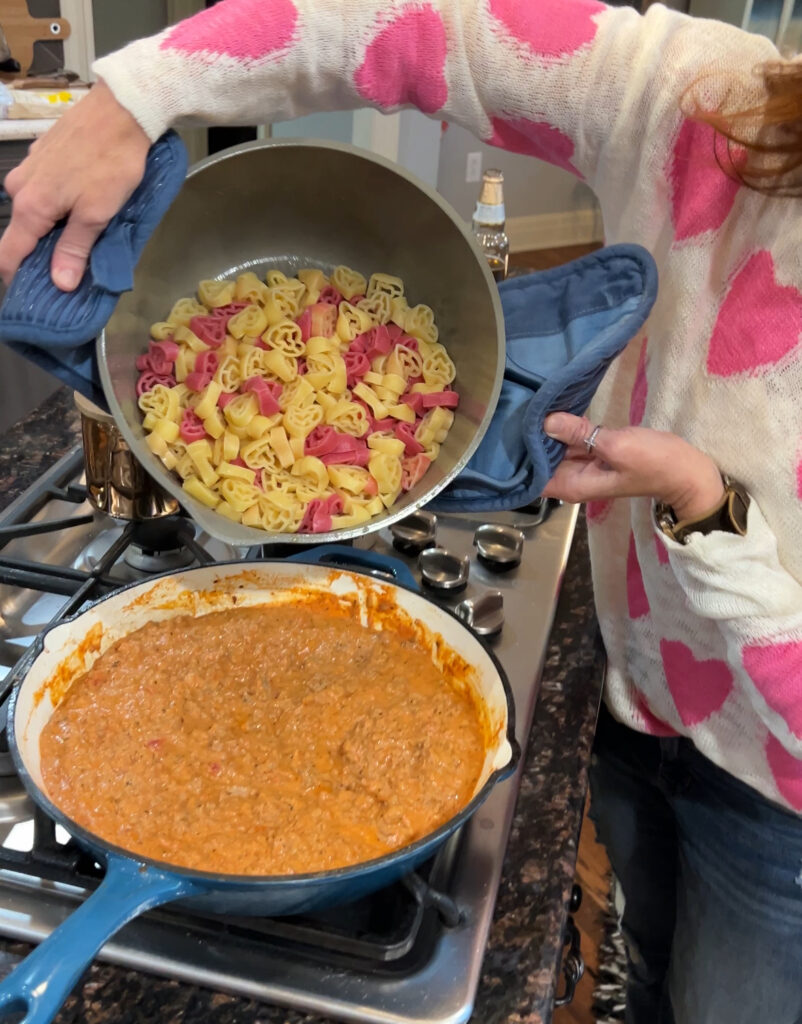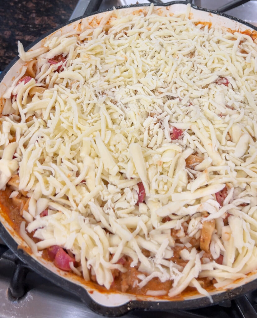 Then once noodles are cooked add to the skillet with the meat mixture.