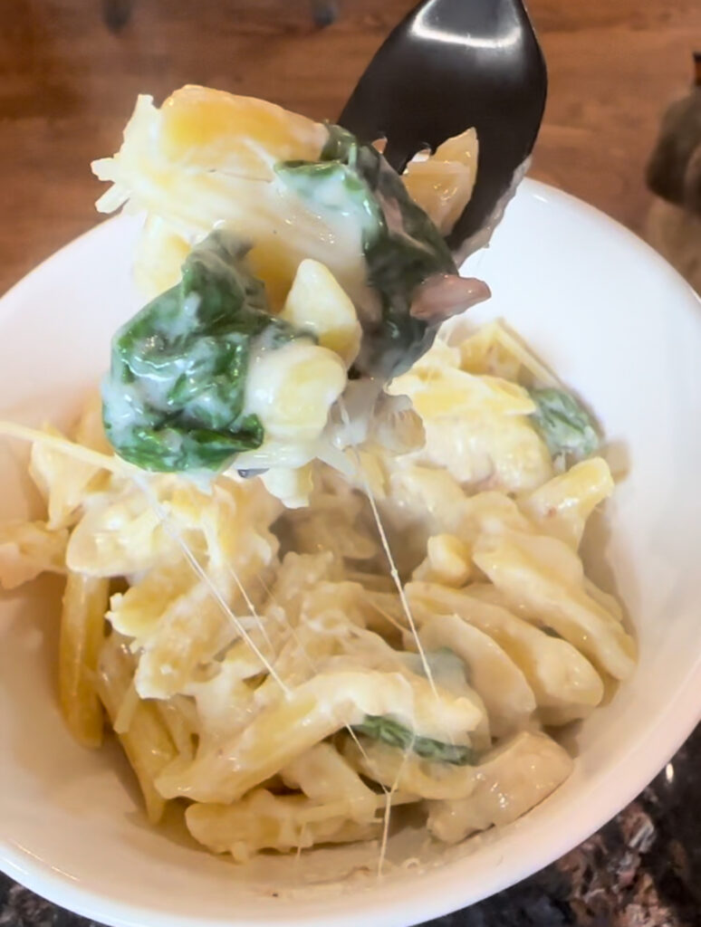 I have made this twice. Love how quick everything comes together. I used broccoli the first time, as some of the family do not care for spinach. The next ti.e i used left over rotisserie chicken and peas. Thank you for sharing your recipes as well as your journey since Quinton passed away. My husband passed away 19 mths ago. Keeping you and the kids in my prayers.
